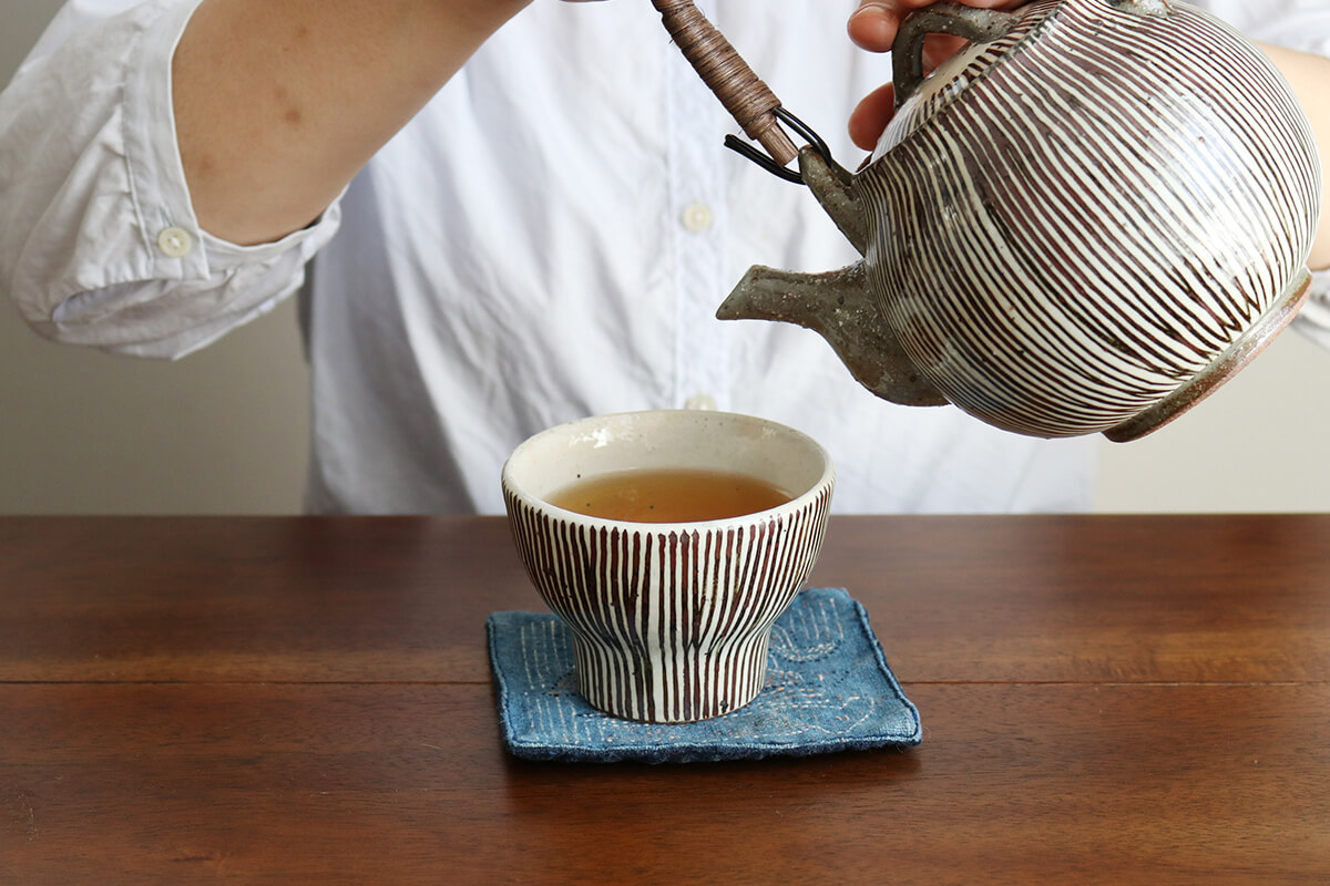 片手に収まりの良い、やや大ぶりな湯呑。厚みのある成形でお茶が冷めにくく、白化粧のやわらかな表情が引き立ちます。湯呑としてはもちろん、小鉢やお酒用カップとしても活躍。土瓶とセットでの贈り物にもおすすめです。