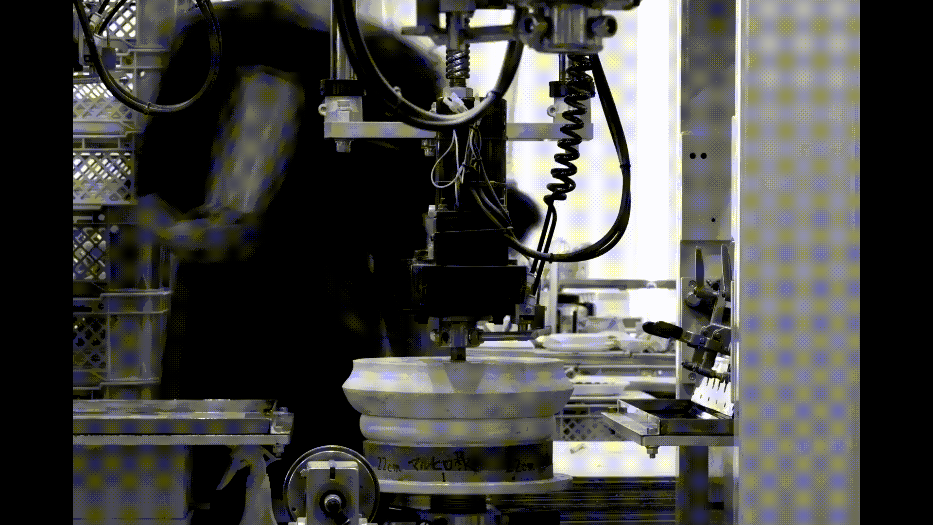 ステンレスの板にシルクスクリーンで柄を刷り、その模様をシリコンパッドに転写。器のフォルムに沿ってパッドが変形しながらプリントを行うことで、多様な形状に正確に絵柄を載せることができます。平面から立体にプリントする技法のため、初期設定の柄合わせに時間と技量を必要とする技法です。