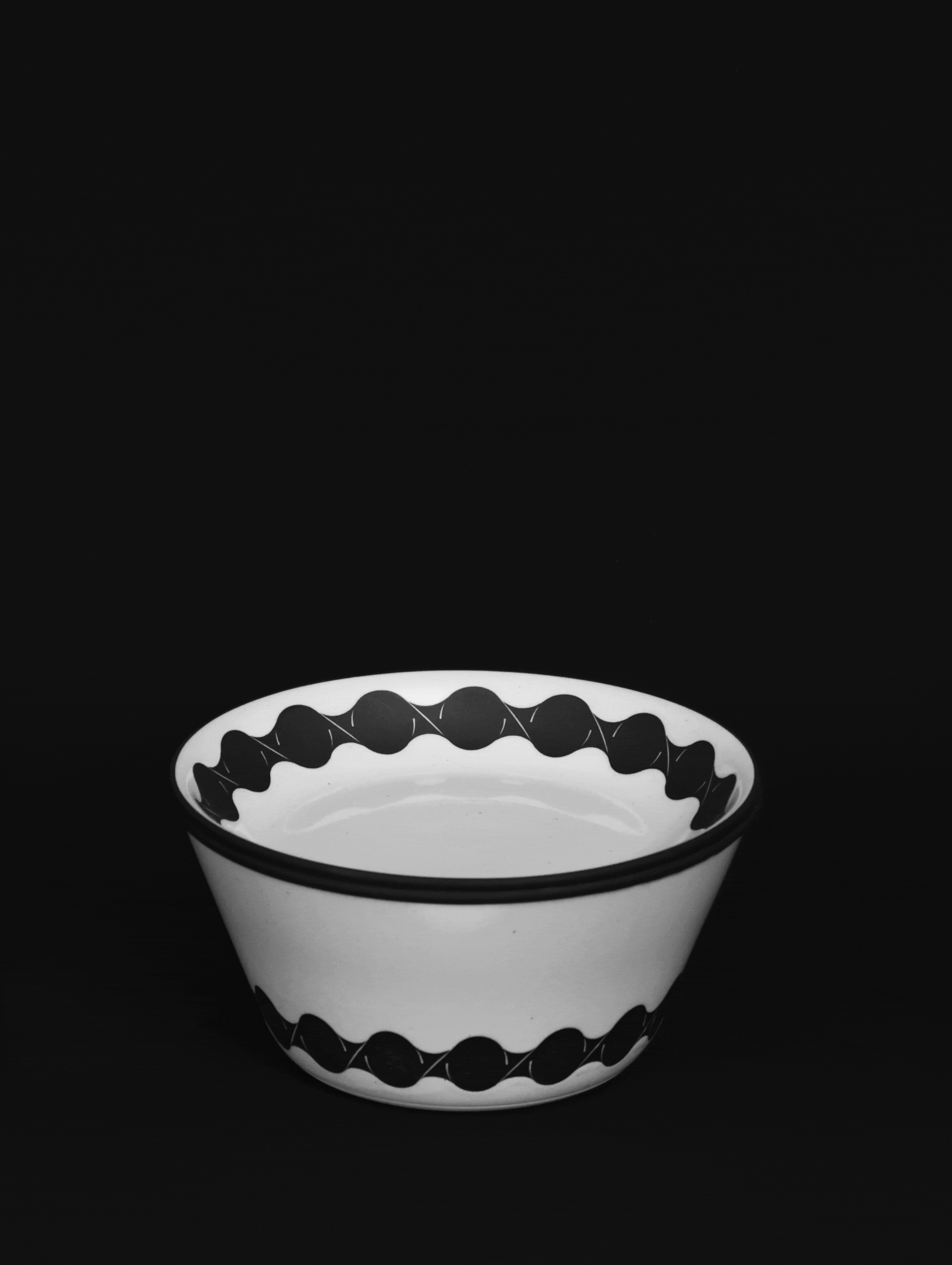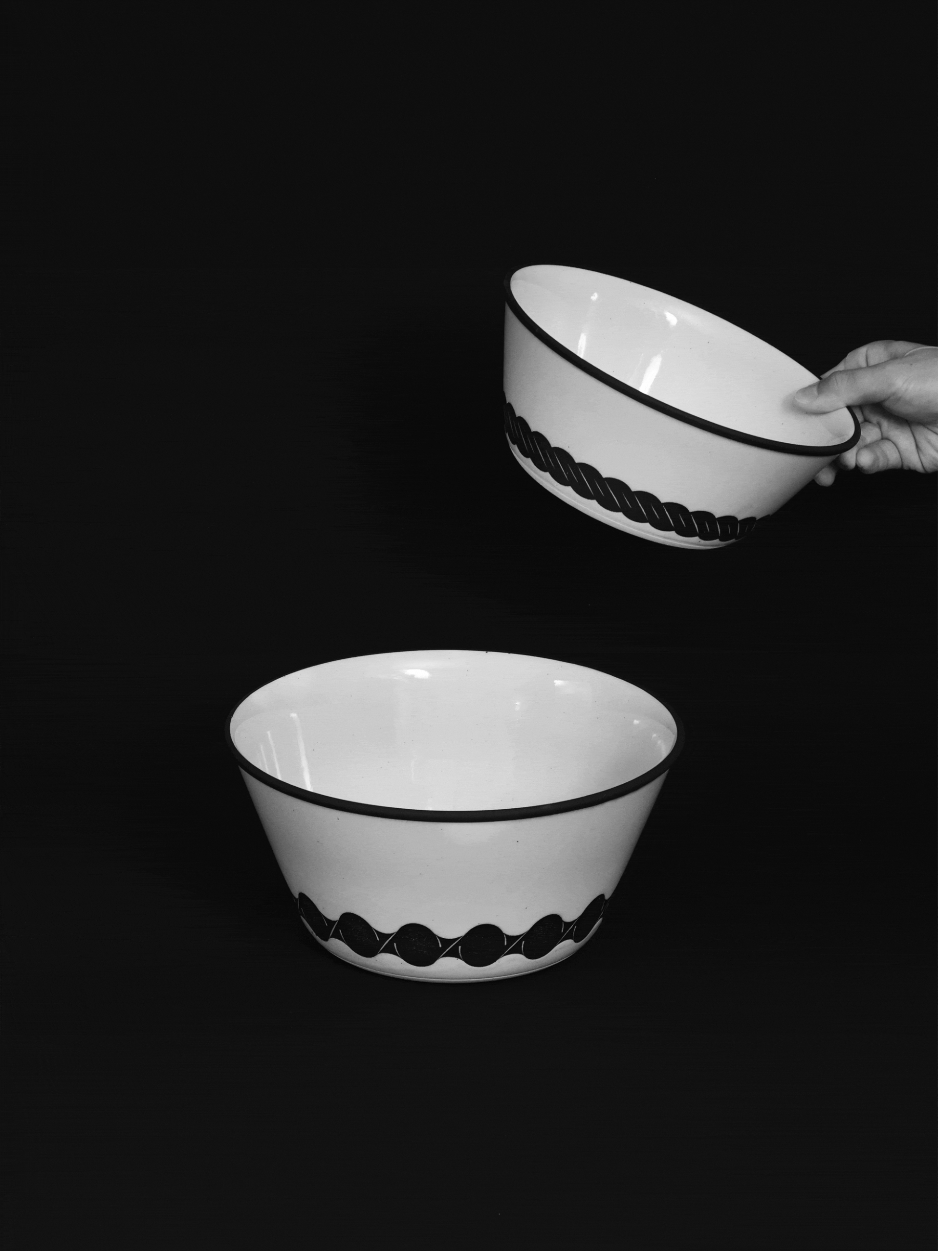 Yasuda’s bold, monochromatic graphics wrap around the rims and bodies of the vessels, drawing inspiration from traditional binding tools such as straw ropes and hoops once used in ceramic packaging.These continuous black patterns reinterpret the structural and decorative beauty of such tools—exceeding their original function and reflecting the ornamental tendencies of late Edo-period design from a contemporary graphic perspective.