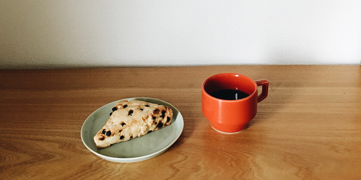 とある日のおうちごはん。スコーンとコーヒーをおともに。「週末に行くキャンプで作るごはん、何作ろうかな?」キャンプは計画を立てることも楽しみのひとつです。