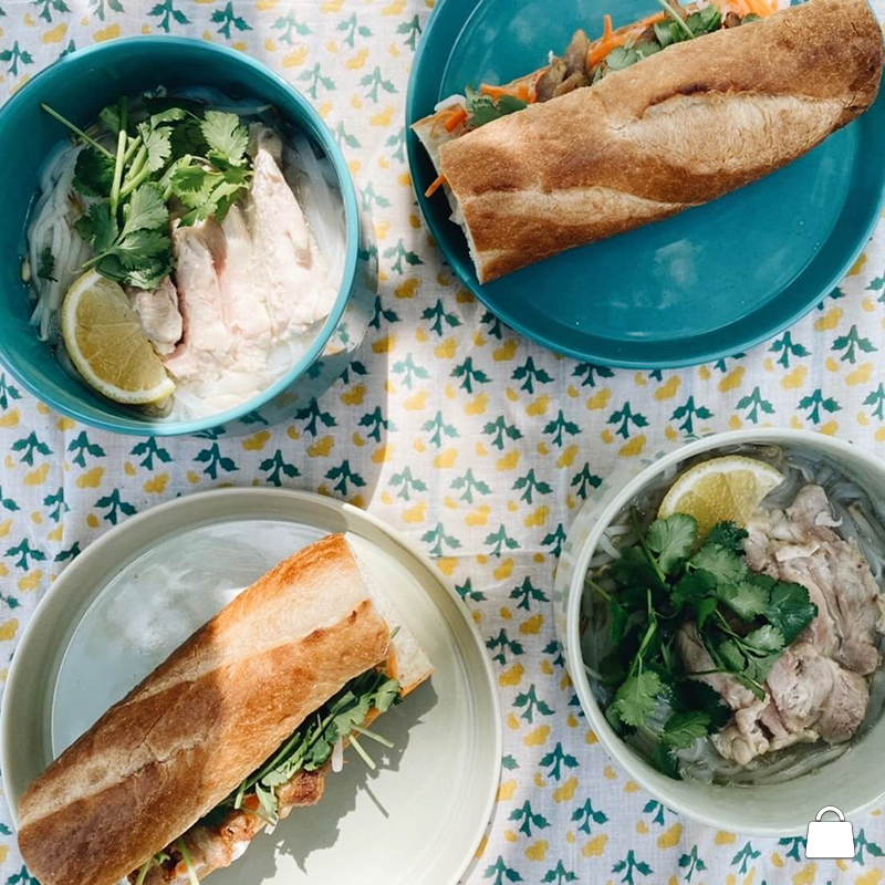 フォーのスープは、鶏がらで出汁をとり、蒸し鶏、レモン、パクチーをトッピング。 バインミーには、スパイスを揉み込んだ鶏肉と、にんじん大根のたっぷり野菜。 そしてここにも、パクチー!