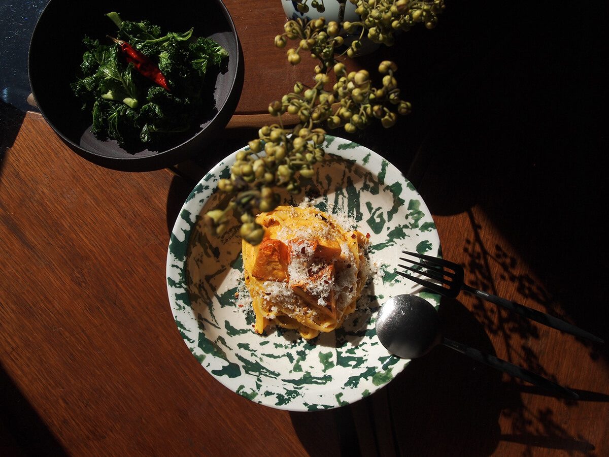 ローストしたかぼちゃをトッピングに、お好みでパルミジャーノレッジャーノ、胡椒をふりかけてめしあがれ。