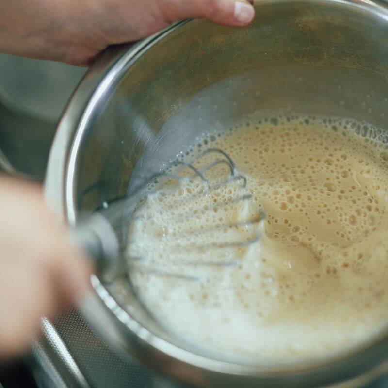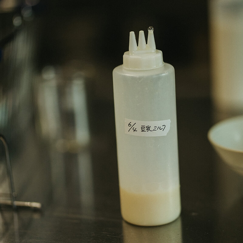 かき氷には豆乳と豆腐、お砂糖で作った自家製豆乳ミルクをかけます。