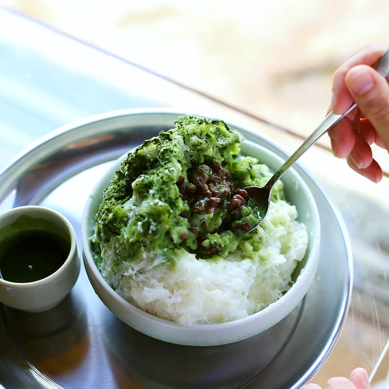 日本一に輝いたそのぎ茶の最高峰抹茶を使った緑茶シロップと自家製豆乳ミルク(豆腐・無調節豆乳・砂糖を使用)をたっぷりかけます。中には小豆が入っています。