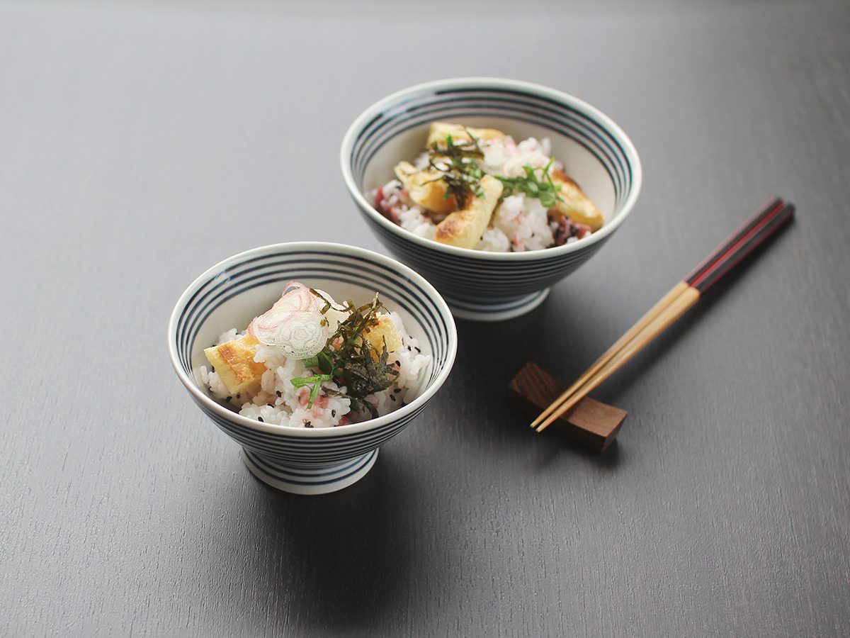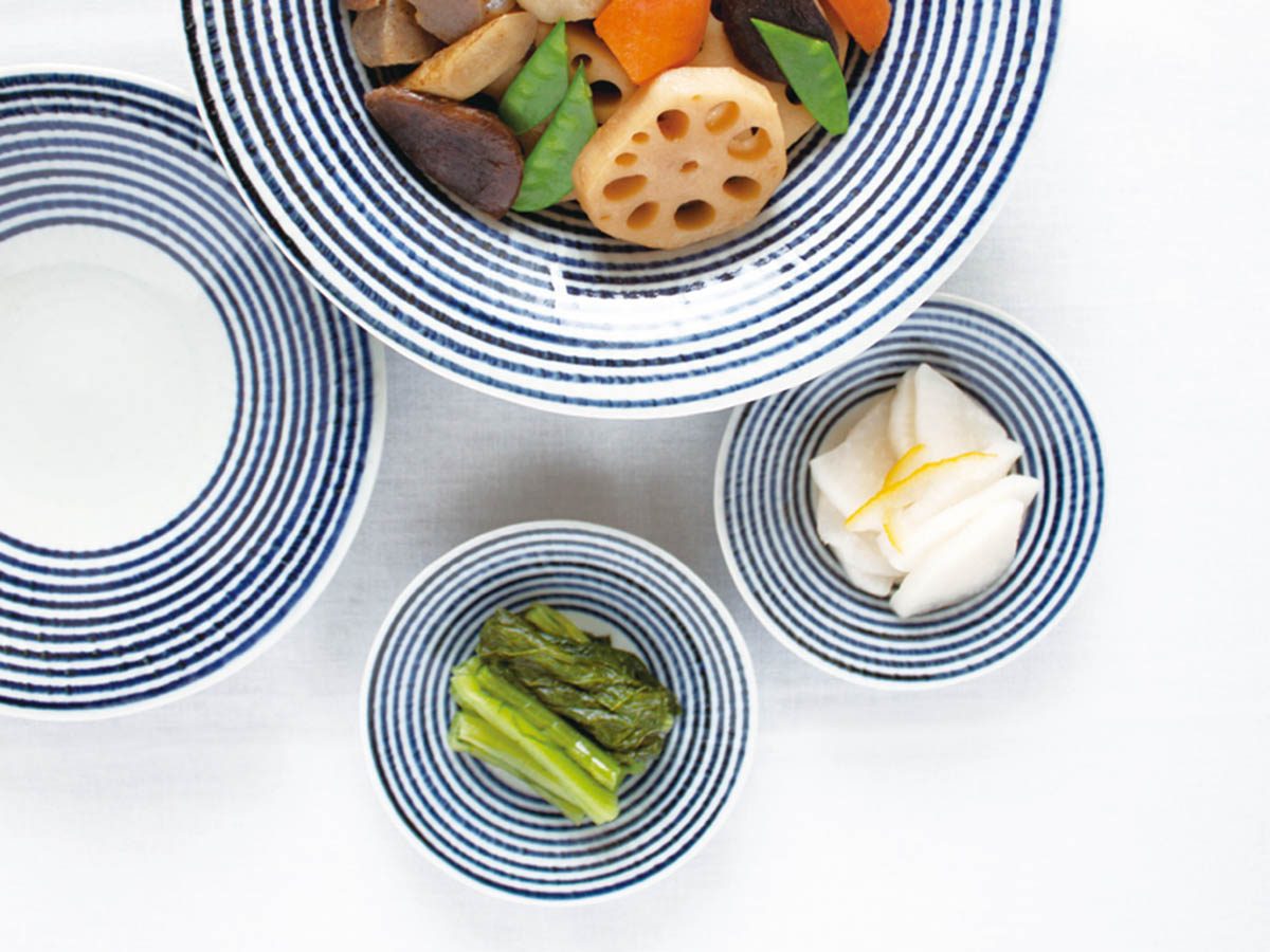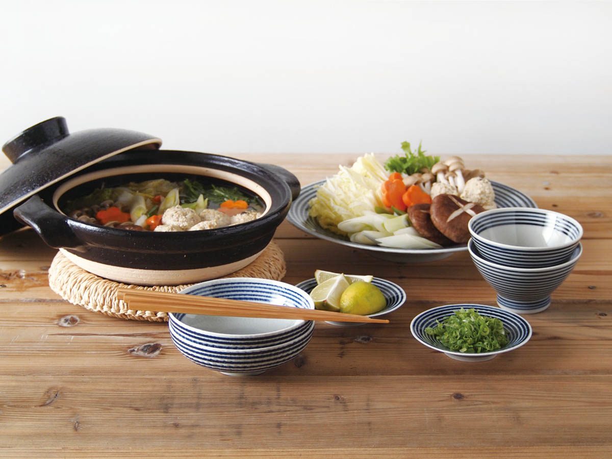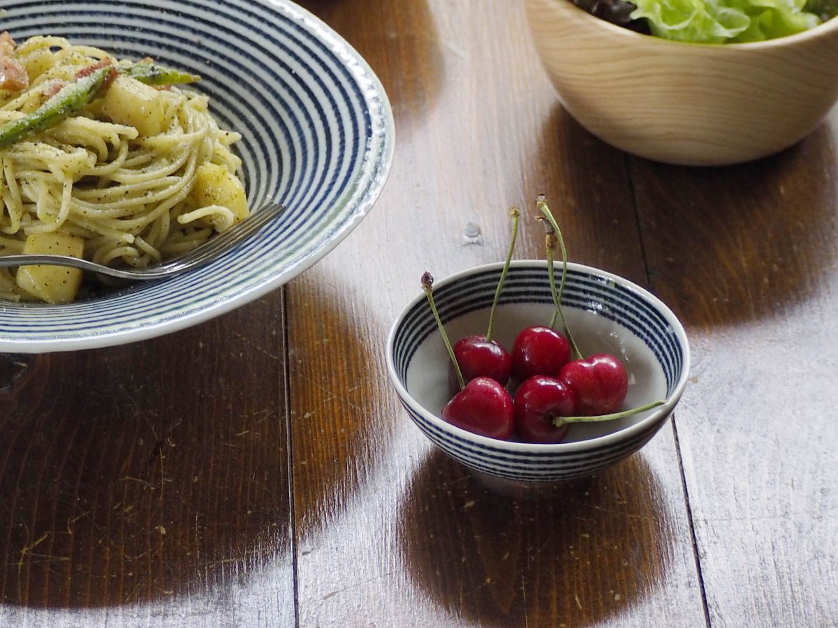 和食にも洋食にも合う、ボーダー柄の中鉢です。3本の脚が付いているので、食卓に立体感が生まれます。