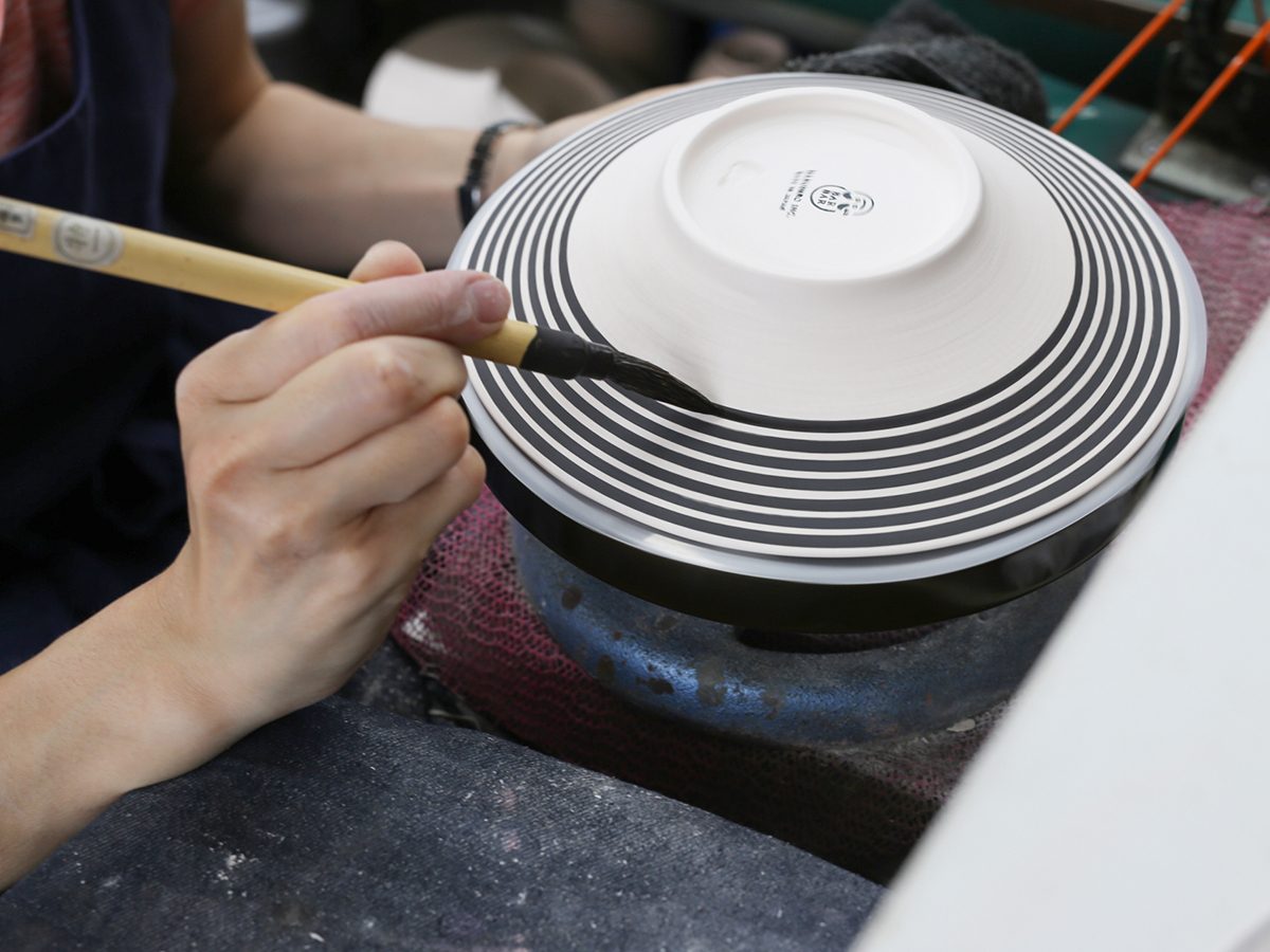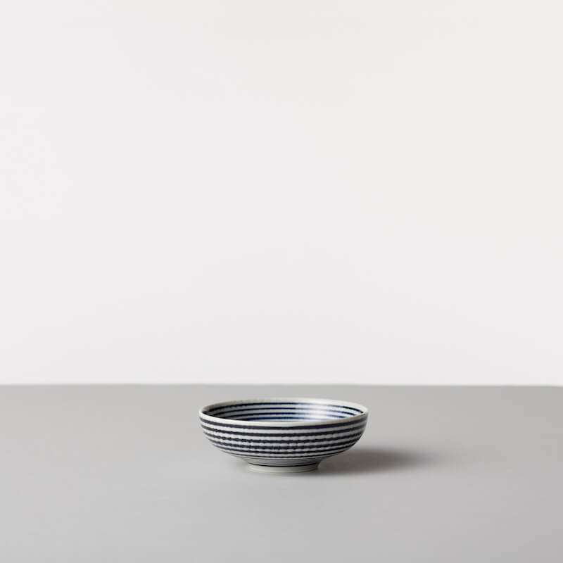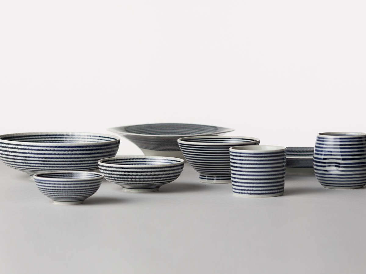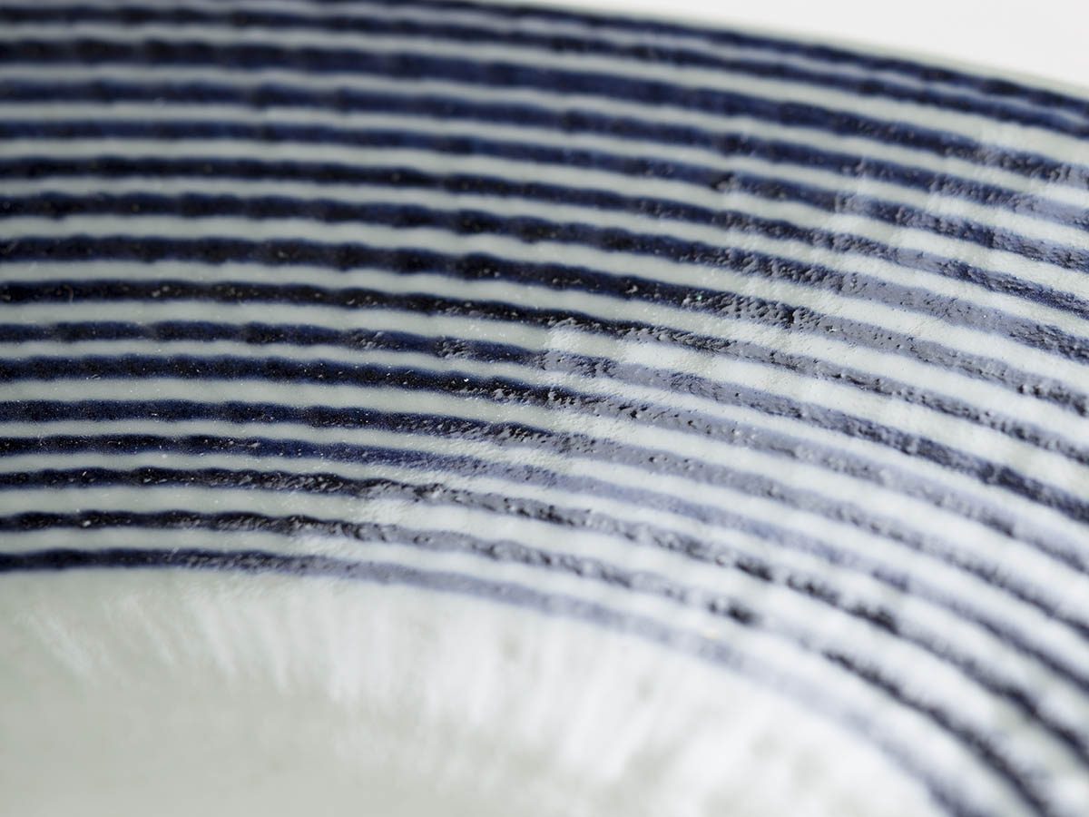 青い線は一本一本手描きで書かれています。線の中に濃淡や強弱があり、風合いのあるボーダー柄。 やや厚めの形はあたたかみのある仕上がりになっています。