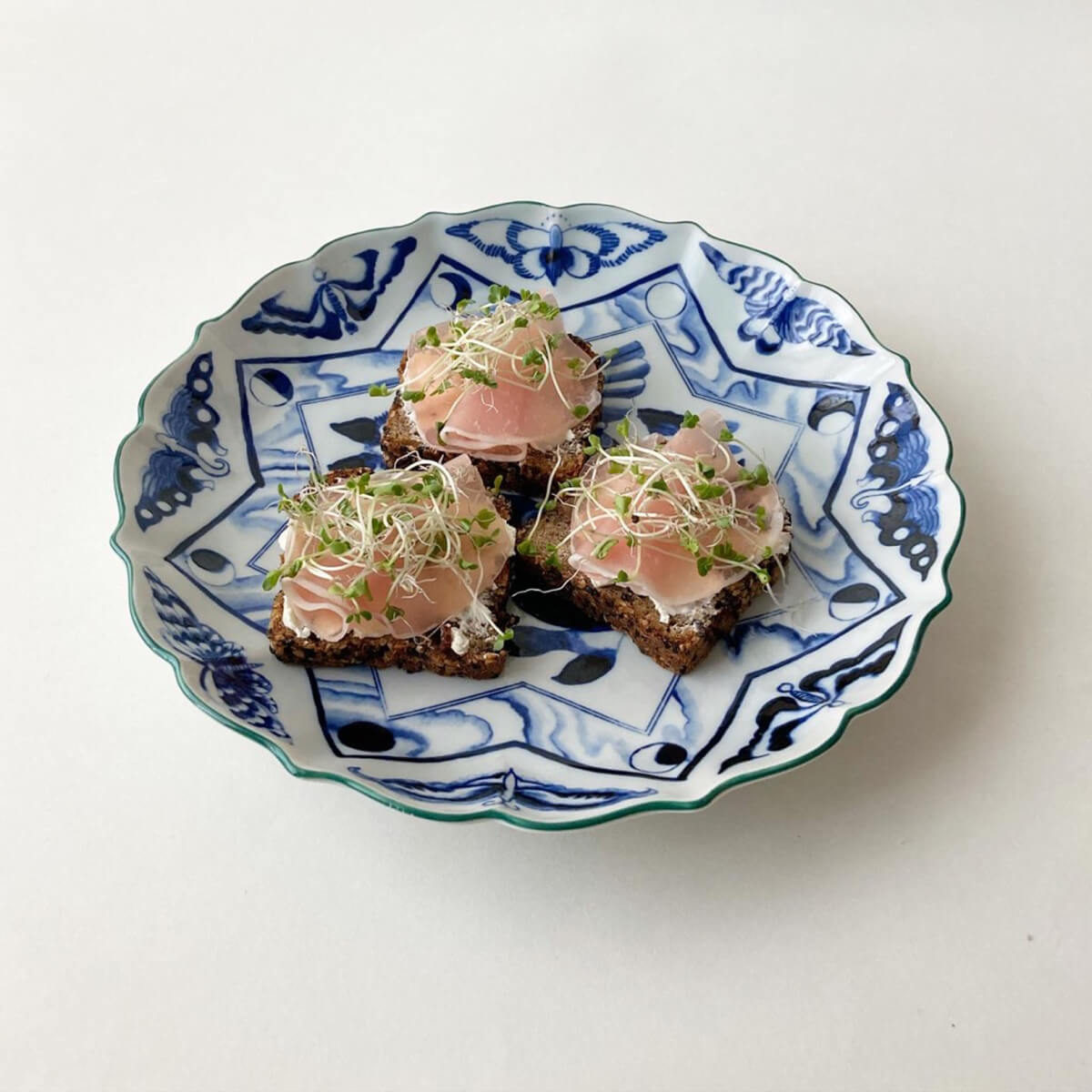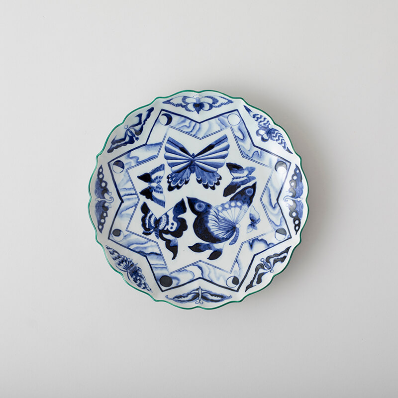 エキセントリックな江戸後期の伊万里焼「図替り大皿」からインスピレーションを受け、その洗練されたジャパネスク的デザイン要素に異なる時代や文化の要素を取り入れた、異国情緒あふれる世界観の染付の大皿です。