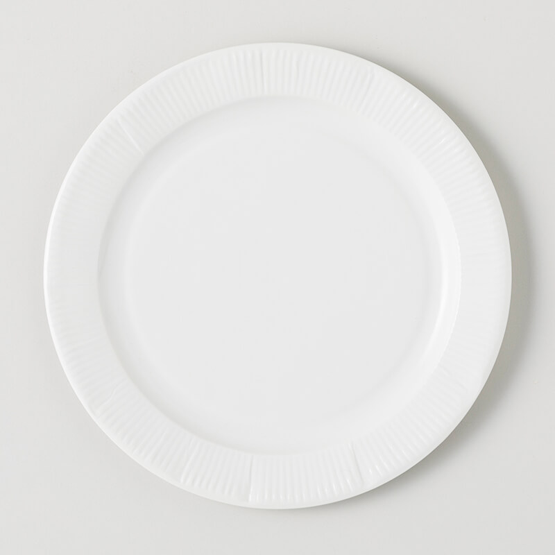紙皿を模した磁器のお皿です。紙皿のようにふにゃふにゃになったり、風に飛ばされたりしない、何よりごみを出さず半永久的に使えるのが嬉しいポイント。