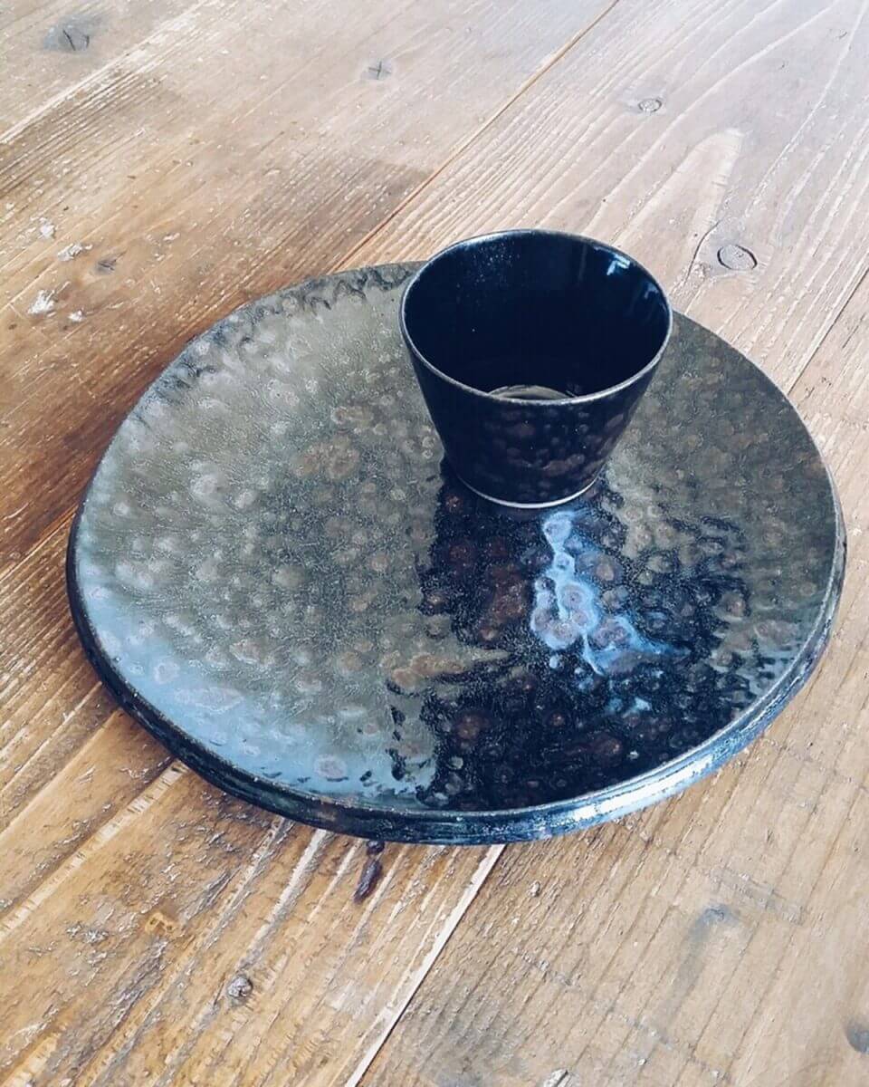 黒に油滴模様がよい。渋いっ! いつもマットな艶消し器を選びがちなので艶有りの黒い器新鮮。 実物はぽってり厚みもあって重みもほどよくて・・・ 想像以上にかっこいい和の器でした。