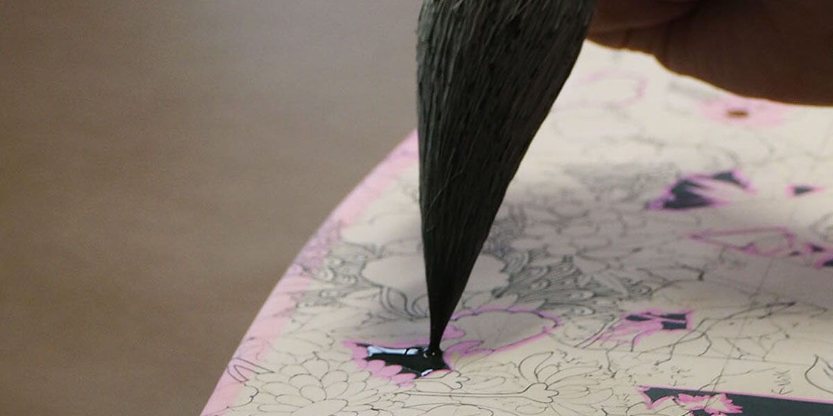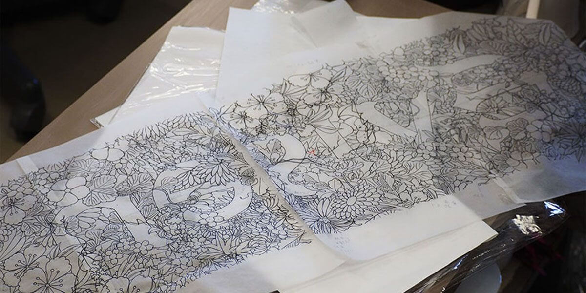 「仲立ち(なかだち)」という工程 下図用の型紙。和紙に墨で文様を描き焼き物にこすって写す。墨は焼成時に燃えるため残らない。