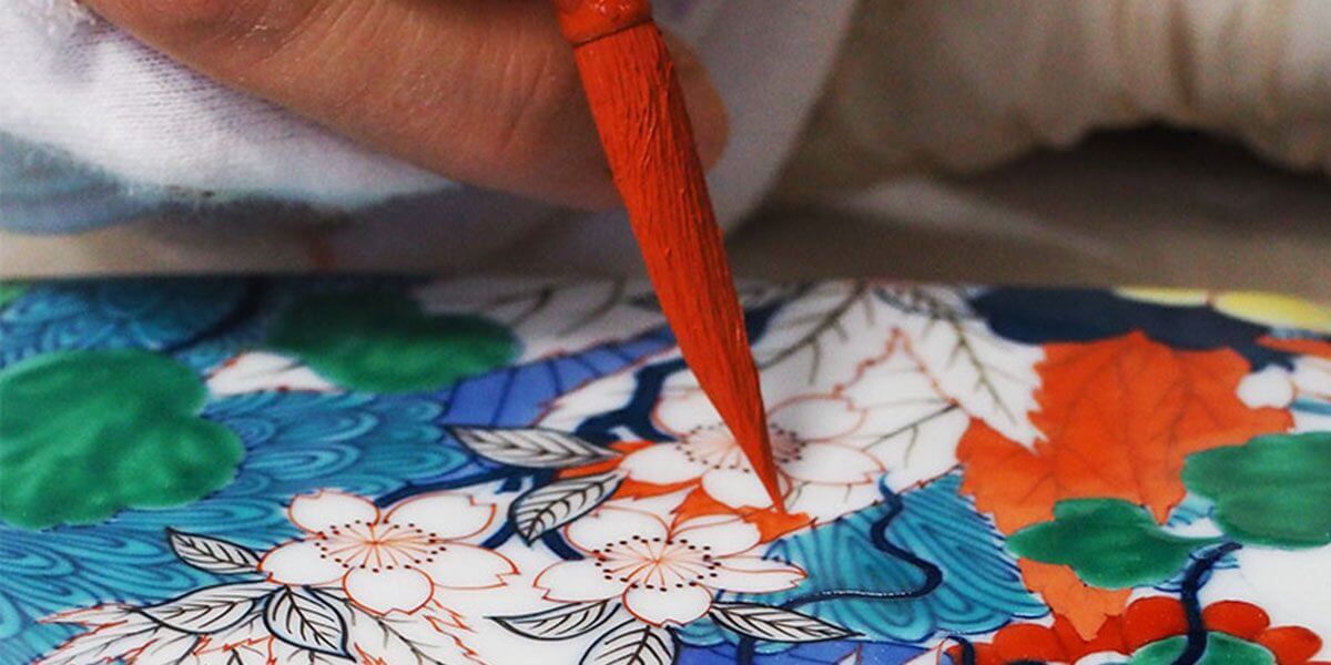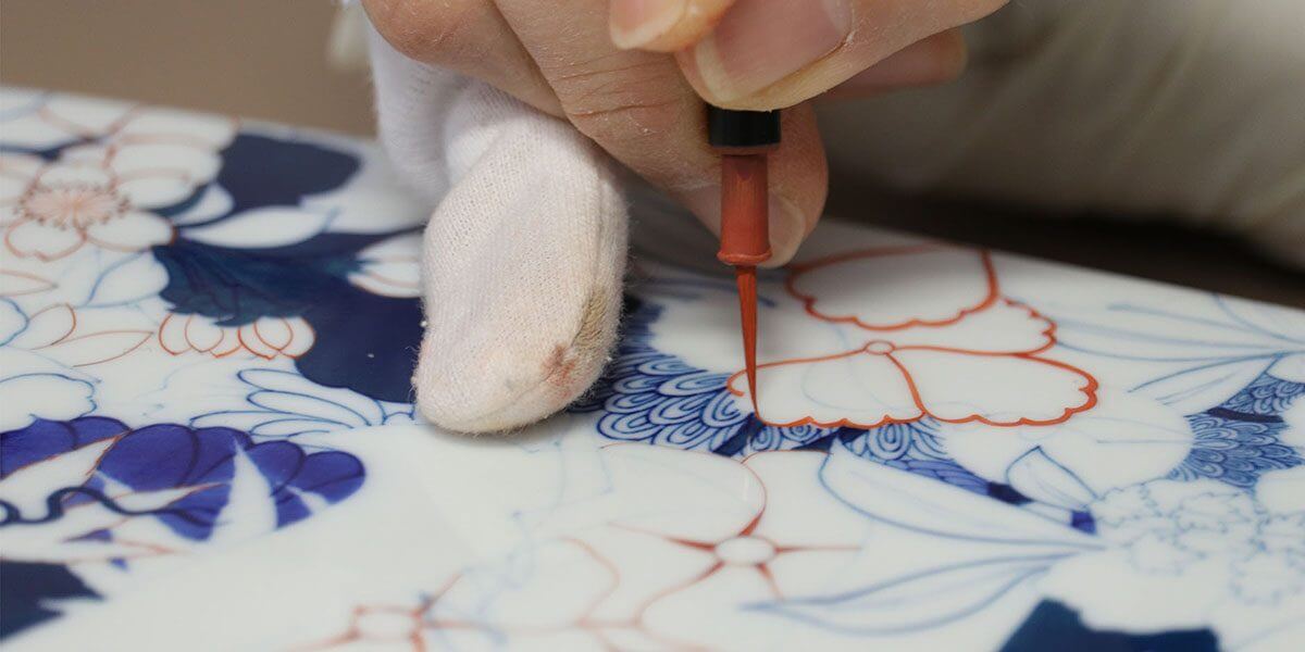 色鮮やかな「百花繚乱」のグラフィックを再現するためにかかった製作期間は1か月。 下絵付けで1回、上絵付けで6回、計7回焼成。それぞれの色ごとに描いては窯入れを繰り返すという気の遠くなるような長きにわたる工程を経て完成しました。 失敗は許されない一発勝負で行われるその緊張感は並々ならぬものです。工程ごとに担当する絵付師がかわり、各工程の最も優れた職人により、着々と彩られていく様は圧巻です。