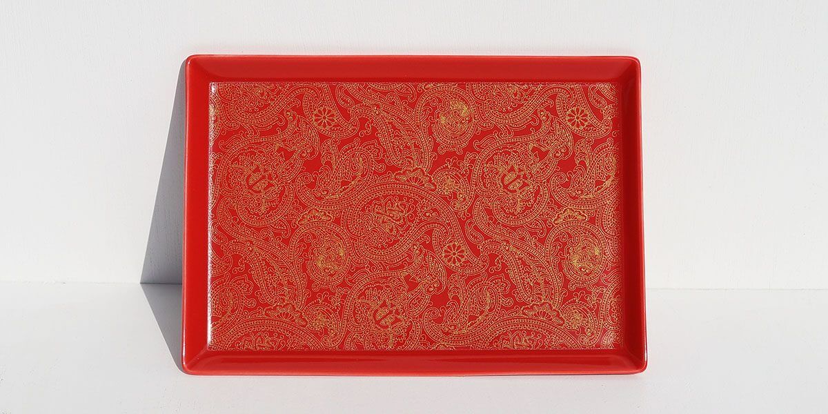 Evisenのペイズリー柄をHASAMAI season1のスクエアプレートに落とし込みました。 赤いプレートに金のプリントが栄え、和洋折衷なテイストは食器としてはもちろんアクアセサリープレート等のインテリアのポイントとしてもご利用いただけます。