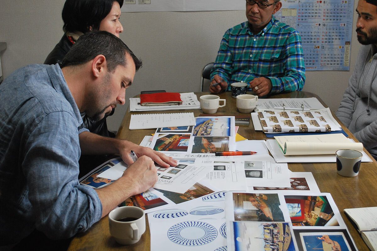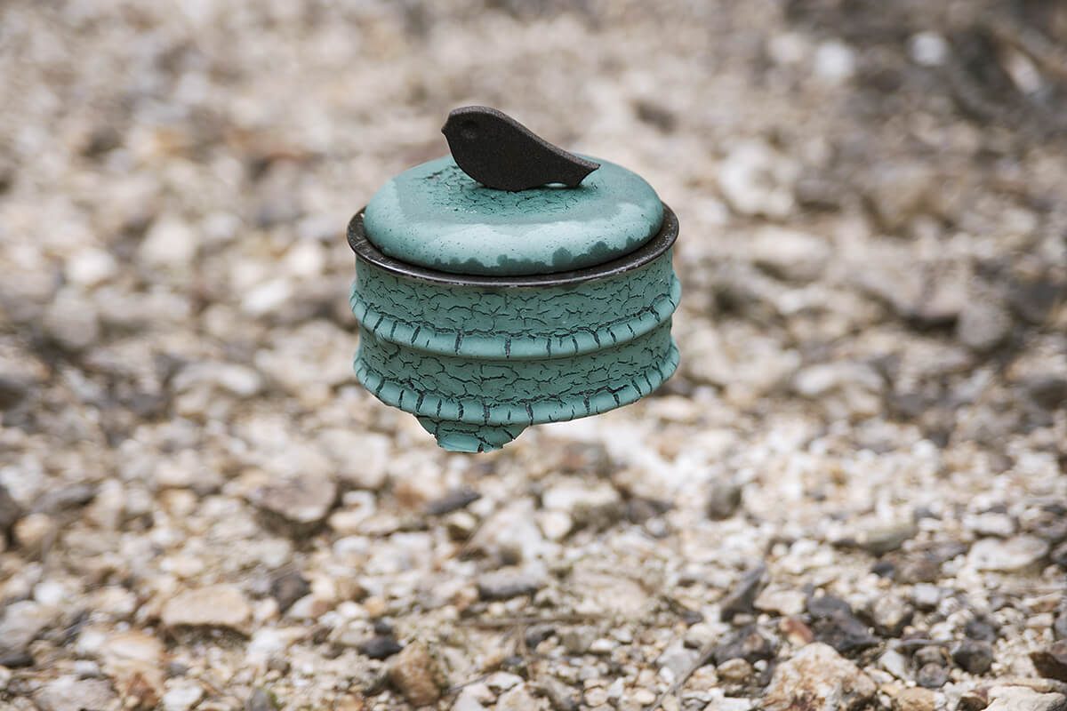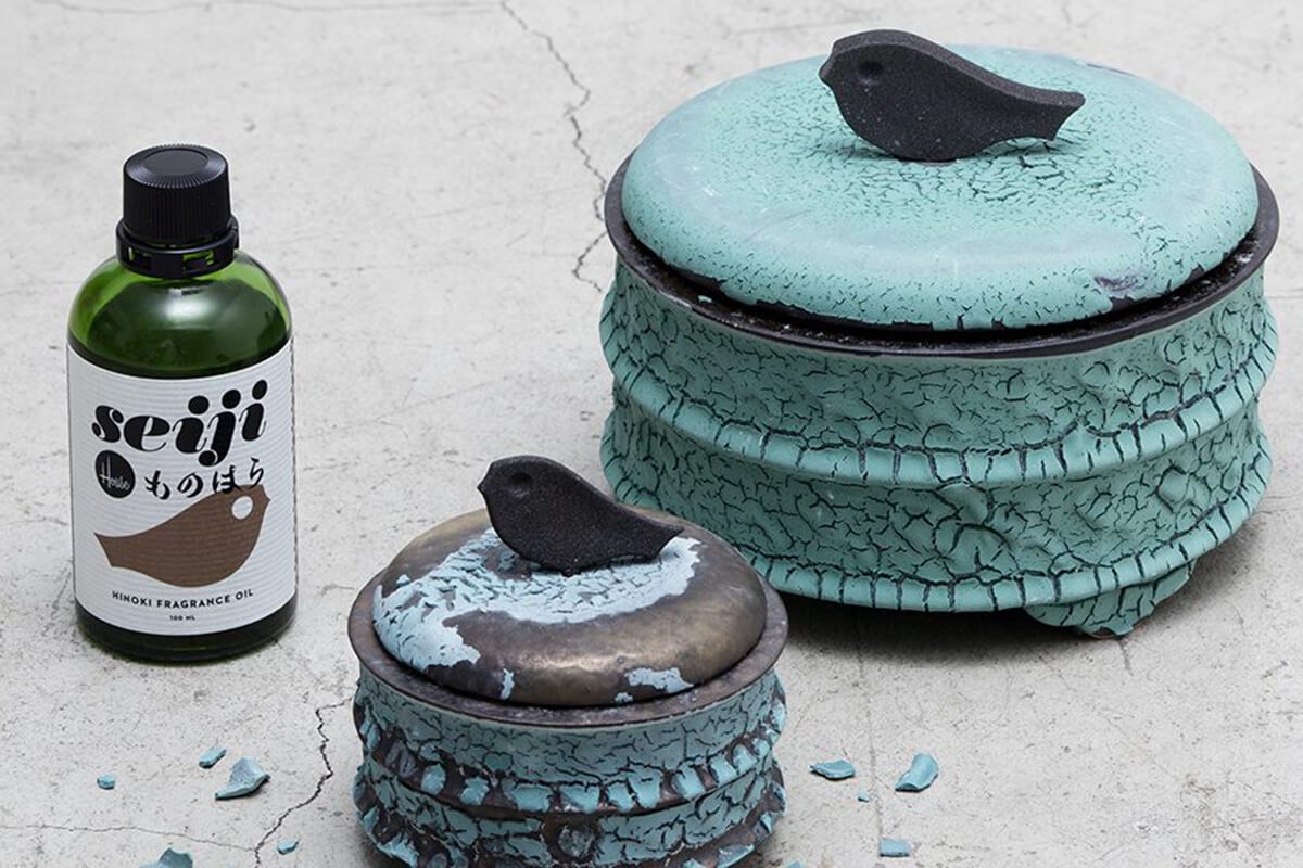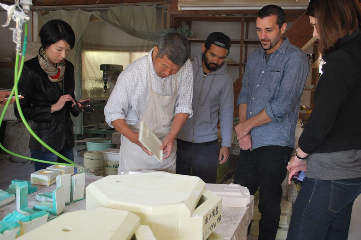 Intricately fashioned with both hand-carved and hand-painted seals, the pieces were treasured among feudal lords, government officials, and Buddhist priests, employed in tea ceremony and cherished for their ornamental value. This collection harkens back to that golden age of celadon with a porcelain lineup reminiscent of Seiji-era tearoom decor. A colored enamel surface is given to each piece using an overglaze technique in homage to the hues of the early Edo-period Mitsunomata porcelain that can be found in the ceramic trash pits of Hasami’s chambered climbing kilns. The ceramic strata that surround the kilns are what local ceramic artists call monohara. Gypsum facades peel away to reveal smooth, pewter surfaces, making every item in the Seiji Collection feel like an ancient archaeological find.