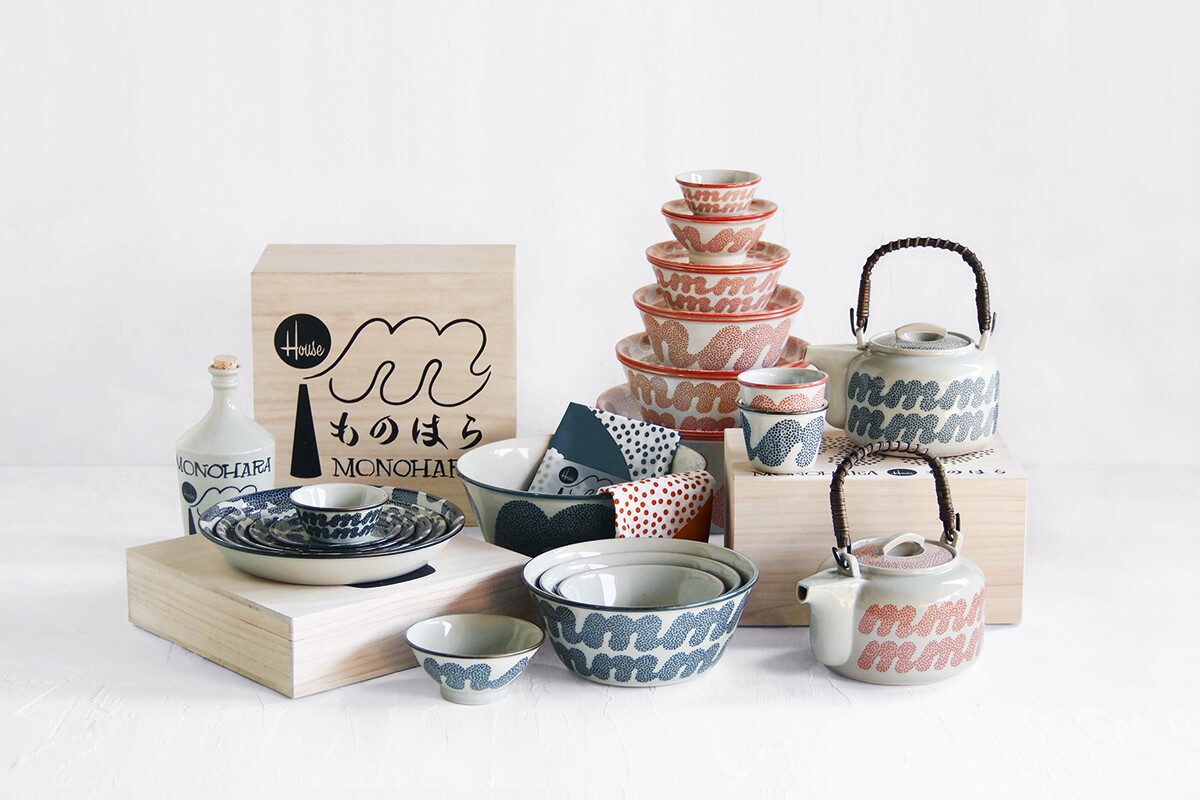 商品の表面には、上絵の顔料で着色された石膏が施されており、波佐見町の登り窯跡の“ものはら”から出土した、江戸初期の「三股青磁(みつのまたせいじ)」の色合いをイメージしています。