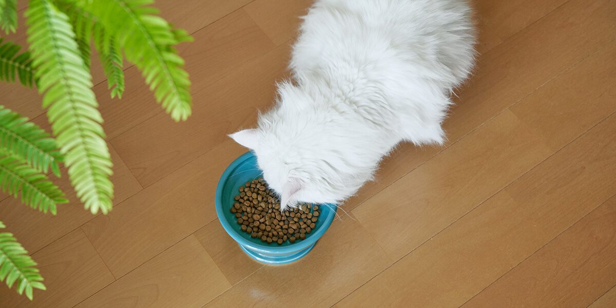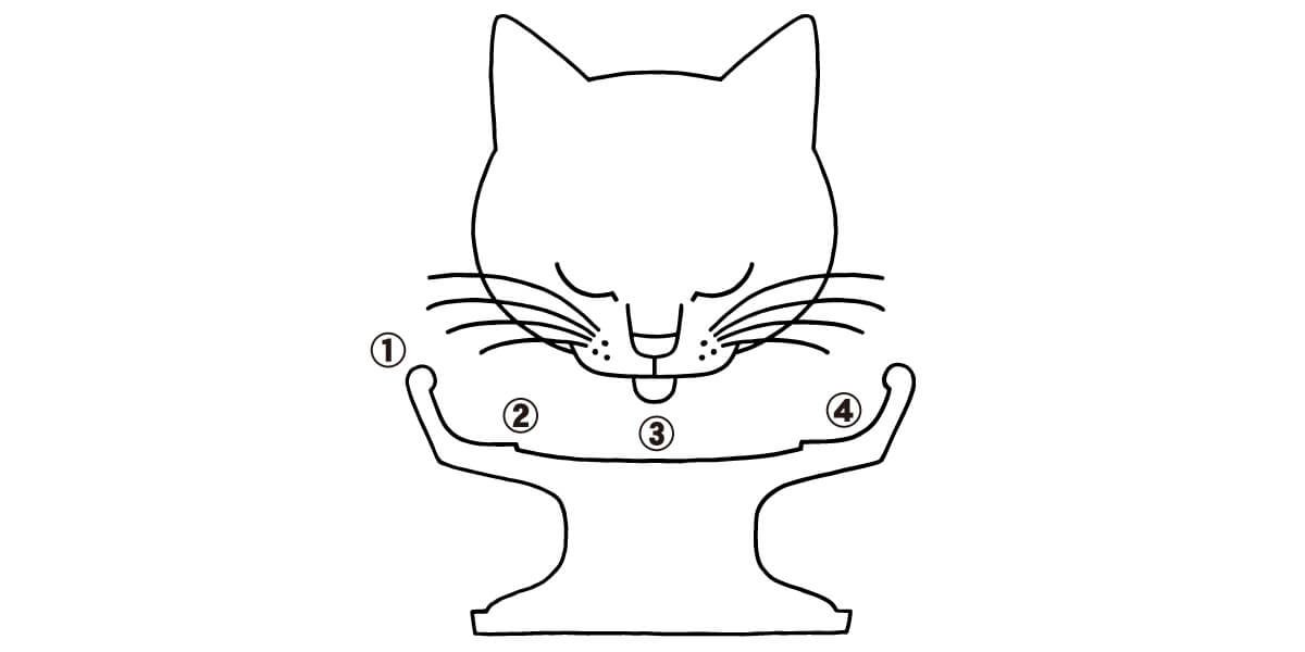 触覚器官である猫のヒゲがフードボウルのフチに接触を強いられる状態になると「ヒゲストレス」が発生します。 浅くて広い形状はヒゲが器に当たりにくく、ヒゲを後ろに反らせて食べなくていいので猫の「ヒゲ疲れ」を軽減します。 食べ残しがある、食事中攻撃的になる、口や手でフードボウルからごはんを外に出して床で食べるなど、ヒゲストレスからくる問題を解消してくれます。