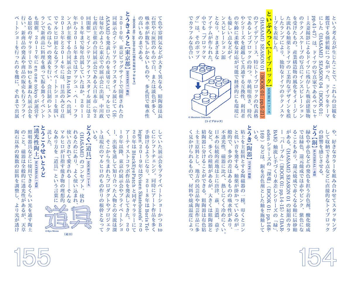 本書は、匡平が2010年に《HASAMI》と《馬場商店(現・BARBAR)》を立ち上げて以降、10年余りに及ぶマルヒロの歩みをまとめたものです。その内容は、マルヒロの手掛けたアイテムやプロジェクトのアーカイブ写真集「BOOK01: Product and Artist Collaboration」と、マルヒロにまつわる用語を集めた事典「BOOK02: Encyclopedia of MARUHIRO」という大きく二つのパートで構成されています。