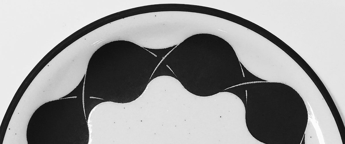 Yasuda’s bold, monochromatic graphics wrap around the rims and bodies of the vessels, drawing inspiration from traditional binding tools such as straw ropes and hoops once used in ceramic packaging.These continuous black patterns reinterpret the structural and decorative beauty of such tools—exceeding their original function and reflecting the ornamental tendencies of late Edo-period design from a contemporary graphic perspective.