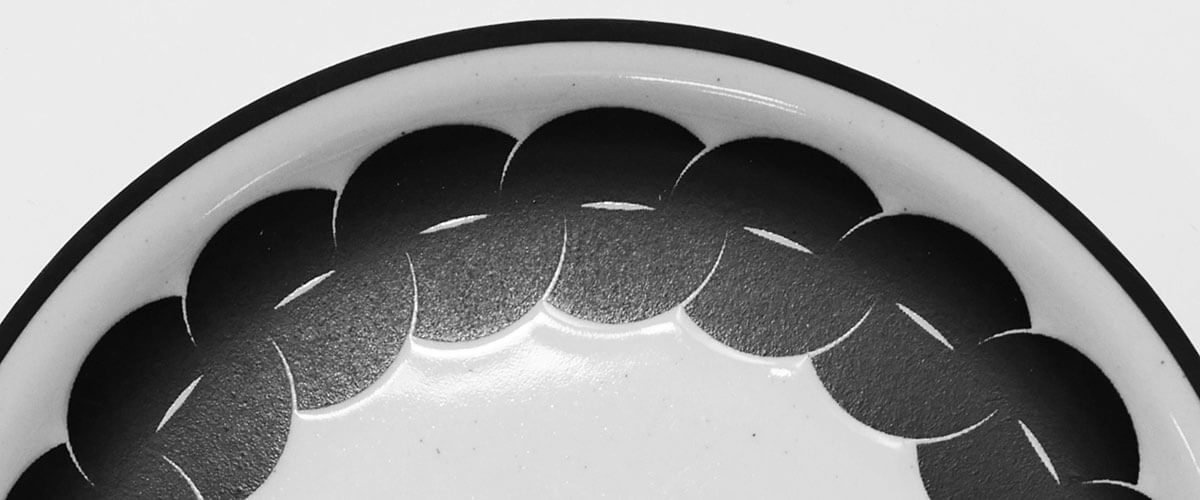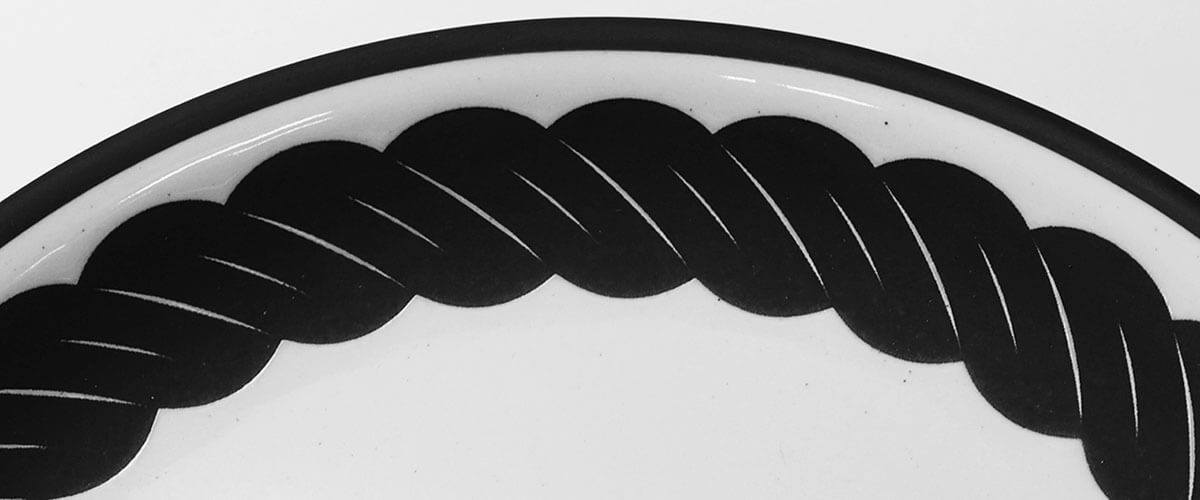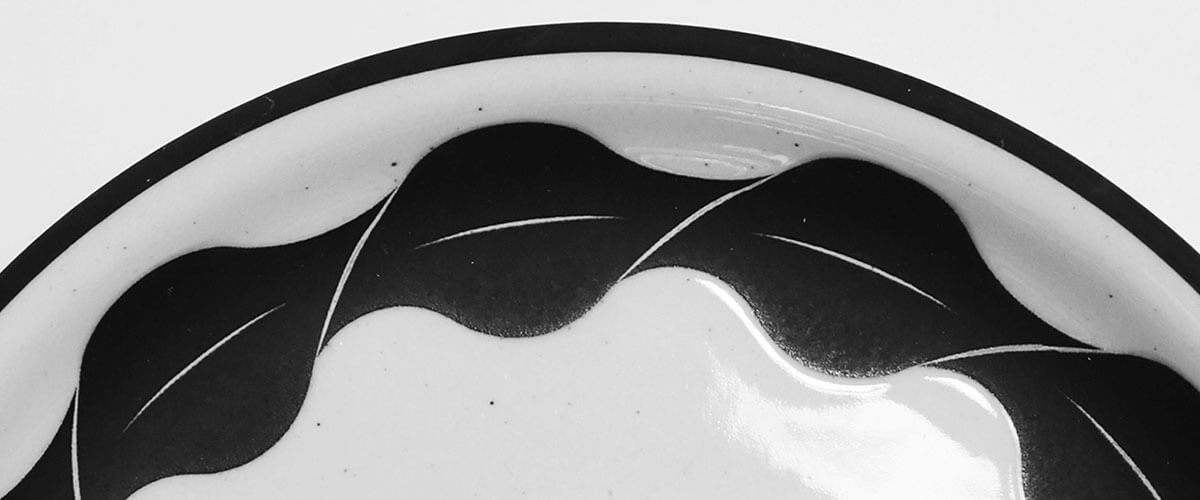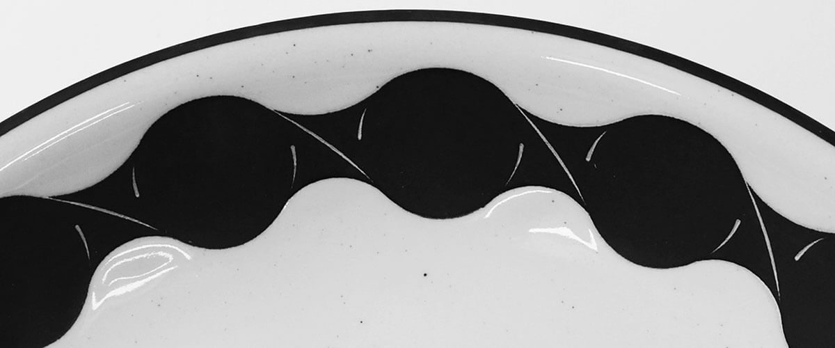 器の縁や胴部には、しめ縄やたが(箍)などかつて器を守るための梱包に用いられていた“しめる”道具に着想を得た、安田氏による黒一色の連続パターンが大胆に描かれています。